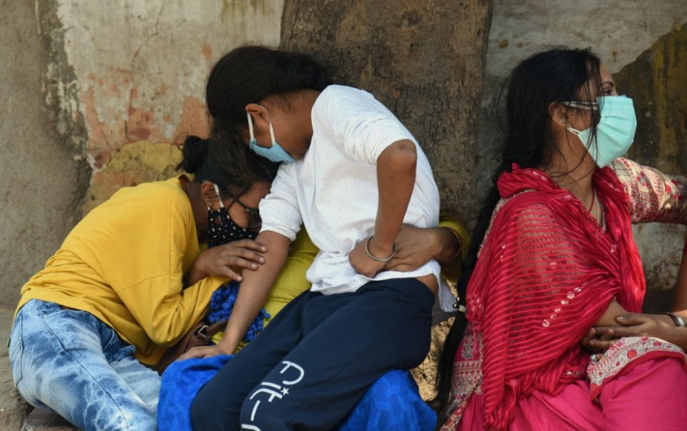 5月5日,在印度巴特那的一所医院外,因新冠失去亲人的人们神色悲伤。(新华社发)