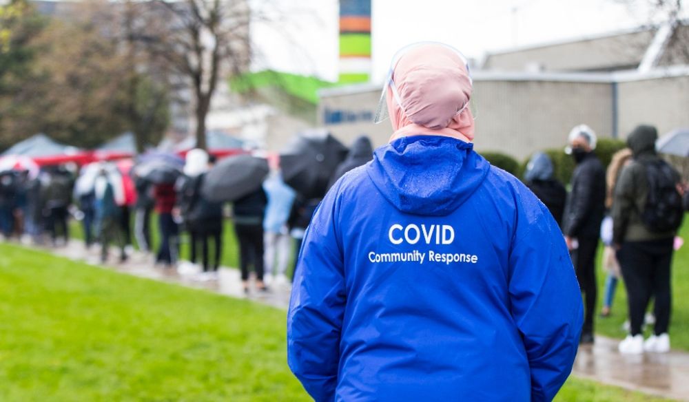 4月28日,在加拿大多伦多一个临时新冠疫苗接种点外,人们排队等待接种。(新华社发,邹峥摄)