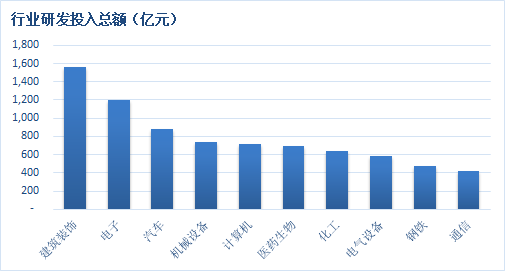 2020年研发投入总额排名前十行业,数据来源:同花顺