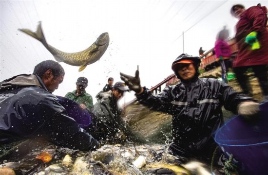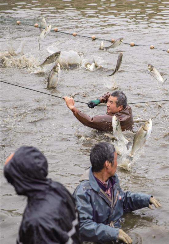 不一会儿,花鲢、草鱼和罗曼鲤鱼等不同品种的鱼在渔网中跳跃,捕鱼队员穿着雨裤站在鱼塘里分工协作,捕捞上来的1万多公斤鱼很快被装进3辆配有制氧设备的专业运输车中,转运至西安的水产市场。