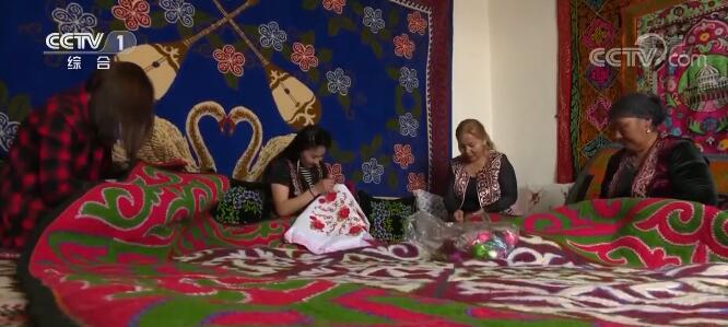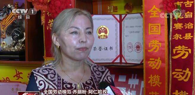 全国劳动模范 乔丽盼·阿仁哈孜:买刺绣的人多了,让我画图案的人也多,我的经济收入提高后盖了房子,买了点牲畜,我用手工艺解决了生活上的困难。看到我收入的邻居和姐妹们也过来跟我学手工艺,我们一起刺绣,一起做毡子,之后出售,生活慢慢富裕了起来。