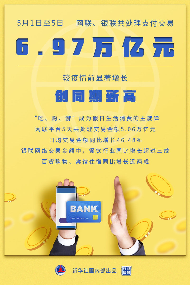2021年5月1日至5日,网联、银联共处理支付交易6.97万亿元