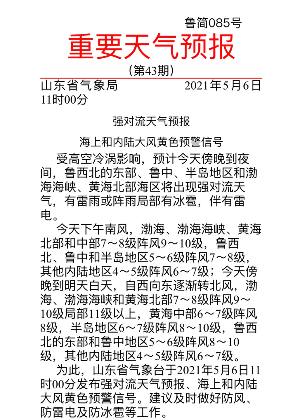 为此,山东省气象台发布强对流天气预报、海上和内陆大风黄色预警信号。建议及时做好防风、防雷电及防冰雹等工作。
