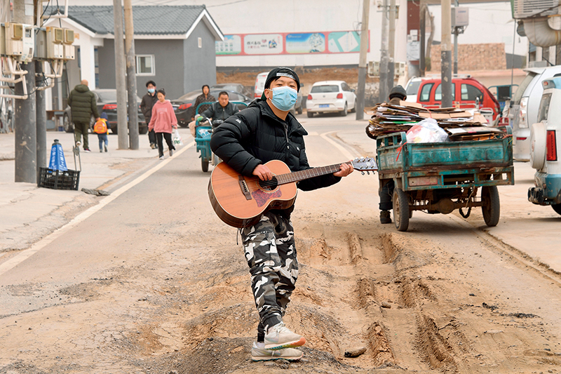 北京市通州区宋庄镇尹各庄村,小海弹奏吉他唱歌(3月15日摄)任超摄/本刊