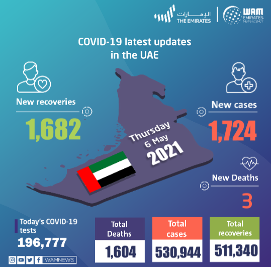 当地时间5月6日,阿联酋卫生和预防部通报该国新增1724例新冠肺炎确诊病例,新增治愈病例1682例,新增死亡病例3例。