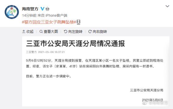 通报称:5月6日12时52分,天涯分局接到报警,在天涯区某小区一名女子坠楼,民警立即赶到现场处置。经查,该女子(史某某,41岁)站在房间阳台外跳舞时坠楼,房间内留有一封遗书。目前,警方正在进一步调查中。
