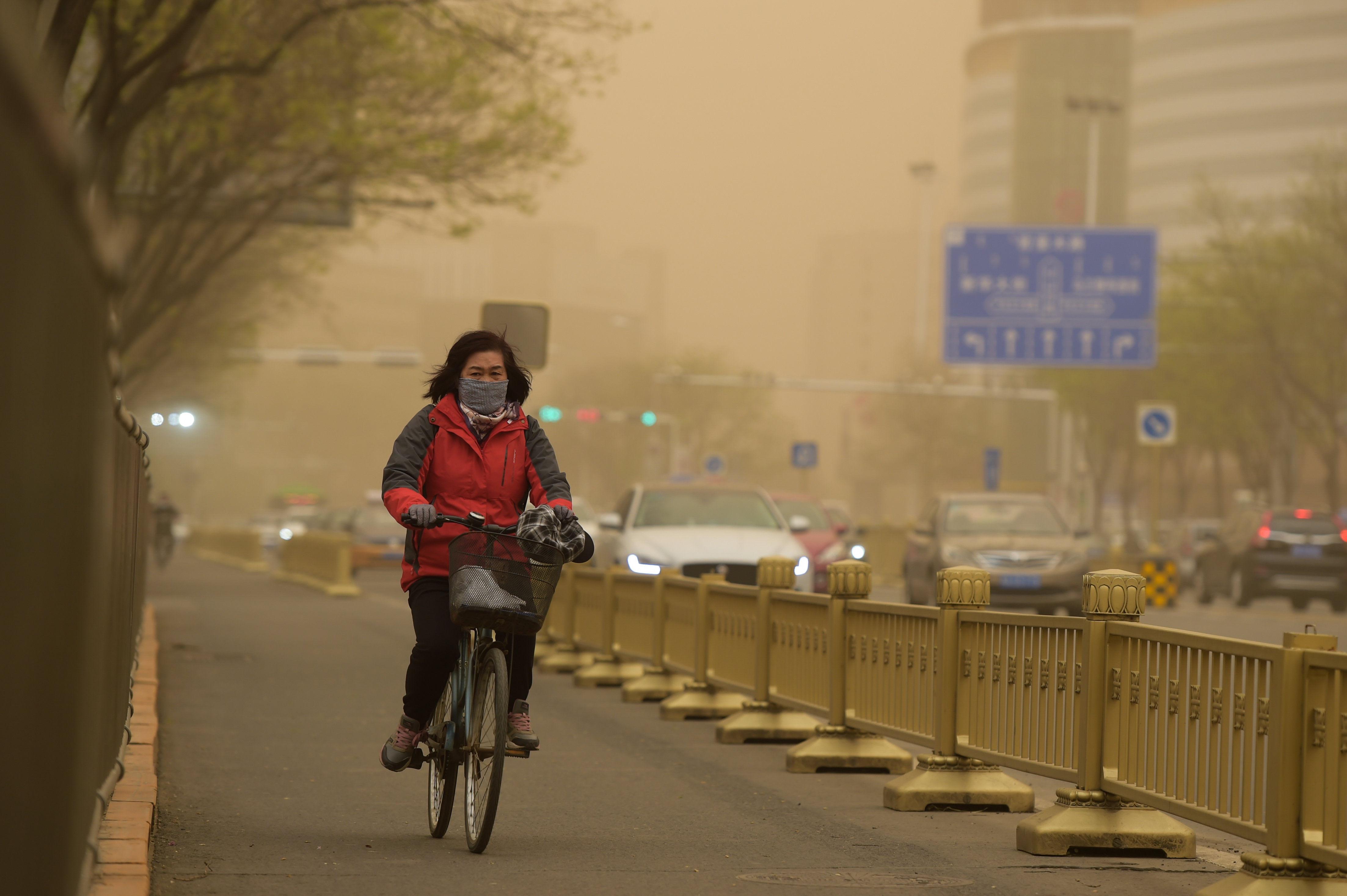 5月6日,一位市民骑自行车经过呼和浩特市中山东路。新华社记者李志鹏 摄