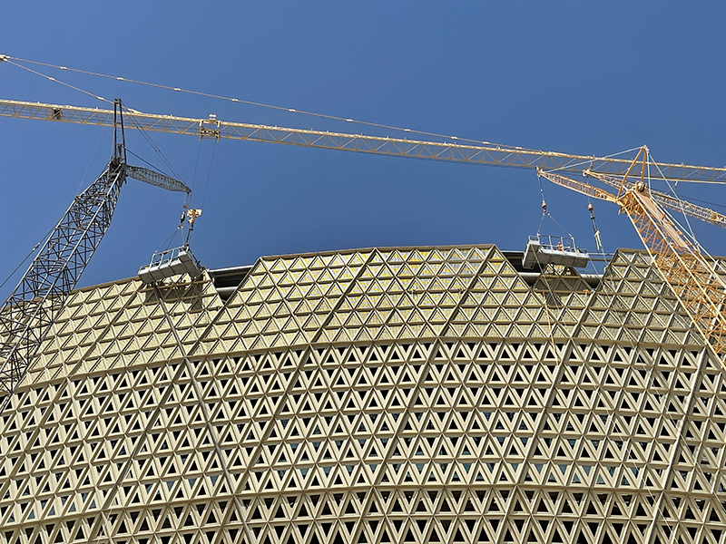 当地时间5月6日,2022年卡塔尔世界杯主体育场卢赛尔体育场的最后一块幕墙单元安装就位,卢赛尔体育场“金色之碗”的外观随之呈现在世人面前。