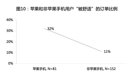 复旦大学管理学院副教授孙金云带领团队在国内5个城市进行了800多次打车测试后发现,当用户选择一键呼叫“经济型+舒适型”两档时,与非iPhone手机用户相比,iPhone手机用户更容易被价格更高的舒适型网约车司机接单,比例为非iPhone手机用户的3倍。