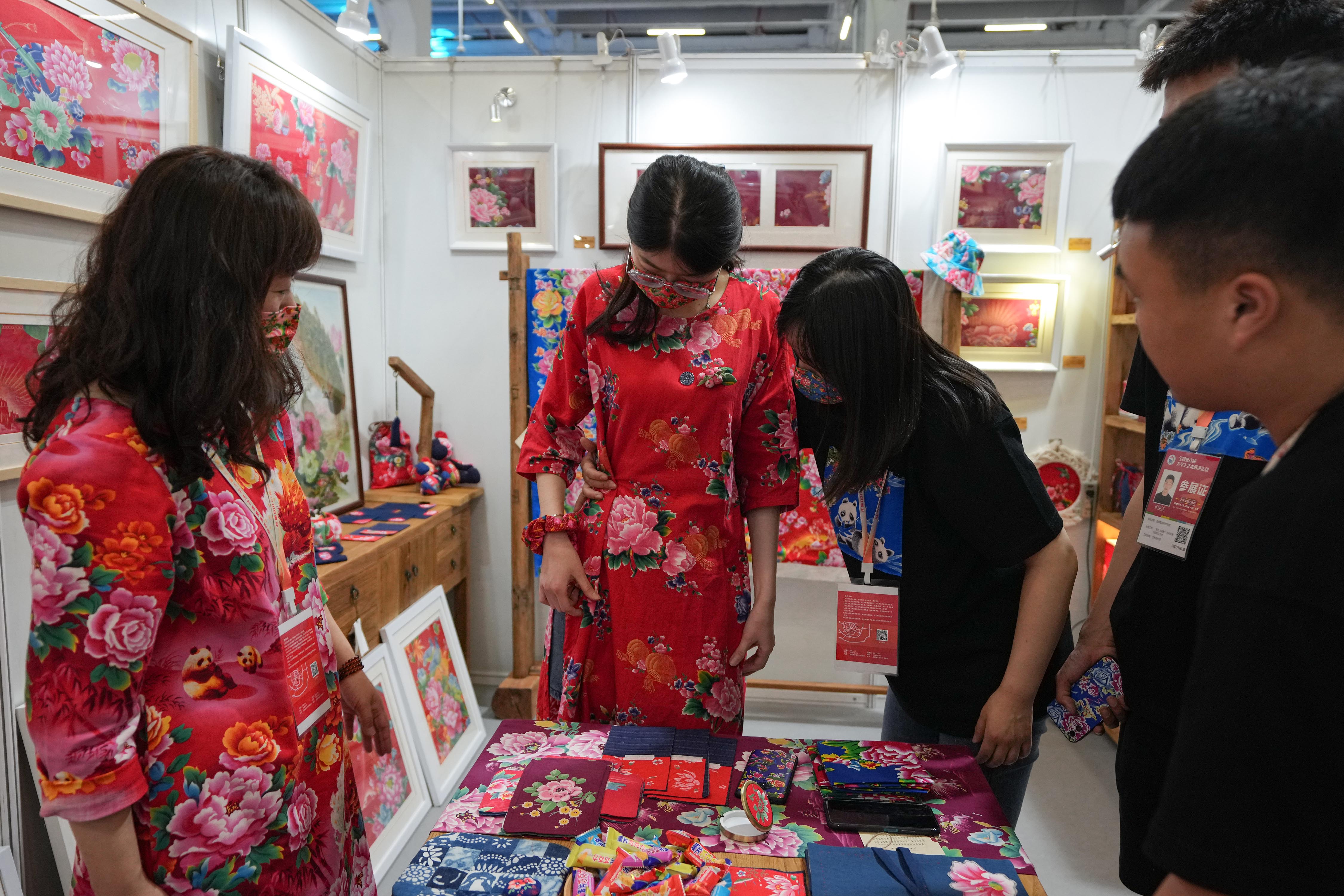 (5月6日,在成都市东郊记忆国际艺术展览中心,吉林建筑科技学院“东北大花布”文化传承与创新工作坊展台里,艺术设计学院公共艺术专业的师生们展示一件穿在学生身上的“喜庆长袍”。新华社记者江宏景摄)