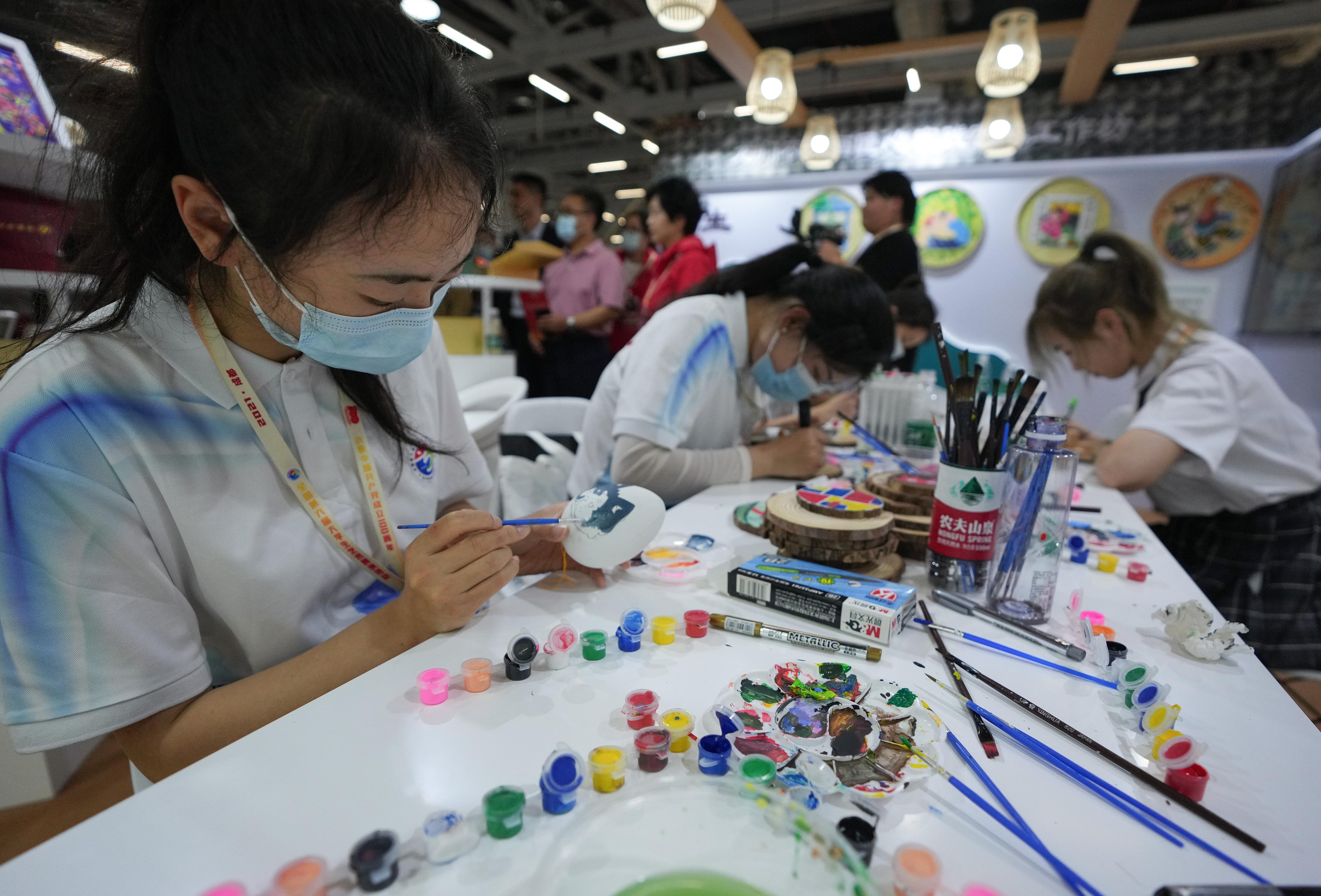 (5月6日,在成都市东郊记忆国际艺术展览中心,成都理工大学学生刘朝霞在惠州学院龙门农民画工作坊展台里体验龙门农民画工艺,图片左一为刘朝霞。新华社记者江宏景摄)