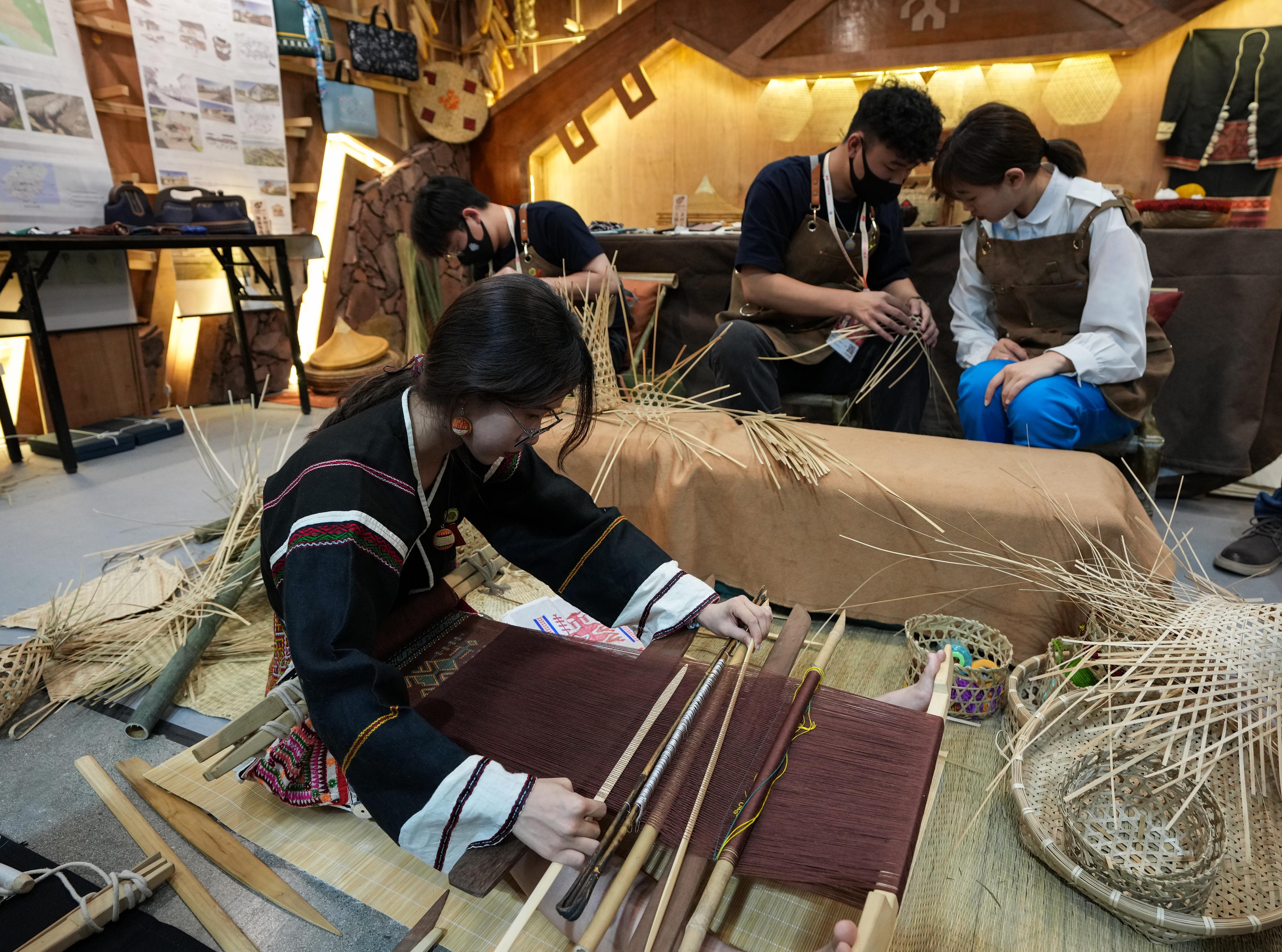 (5月6日,在成都市东郊记忆国际艺术展览中心,海南师范大学的艺术与美丽乡村工作坊的学生们在展演黎锦竹编工艺。新华社记者江宏景摄)
