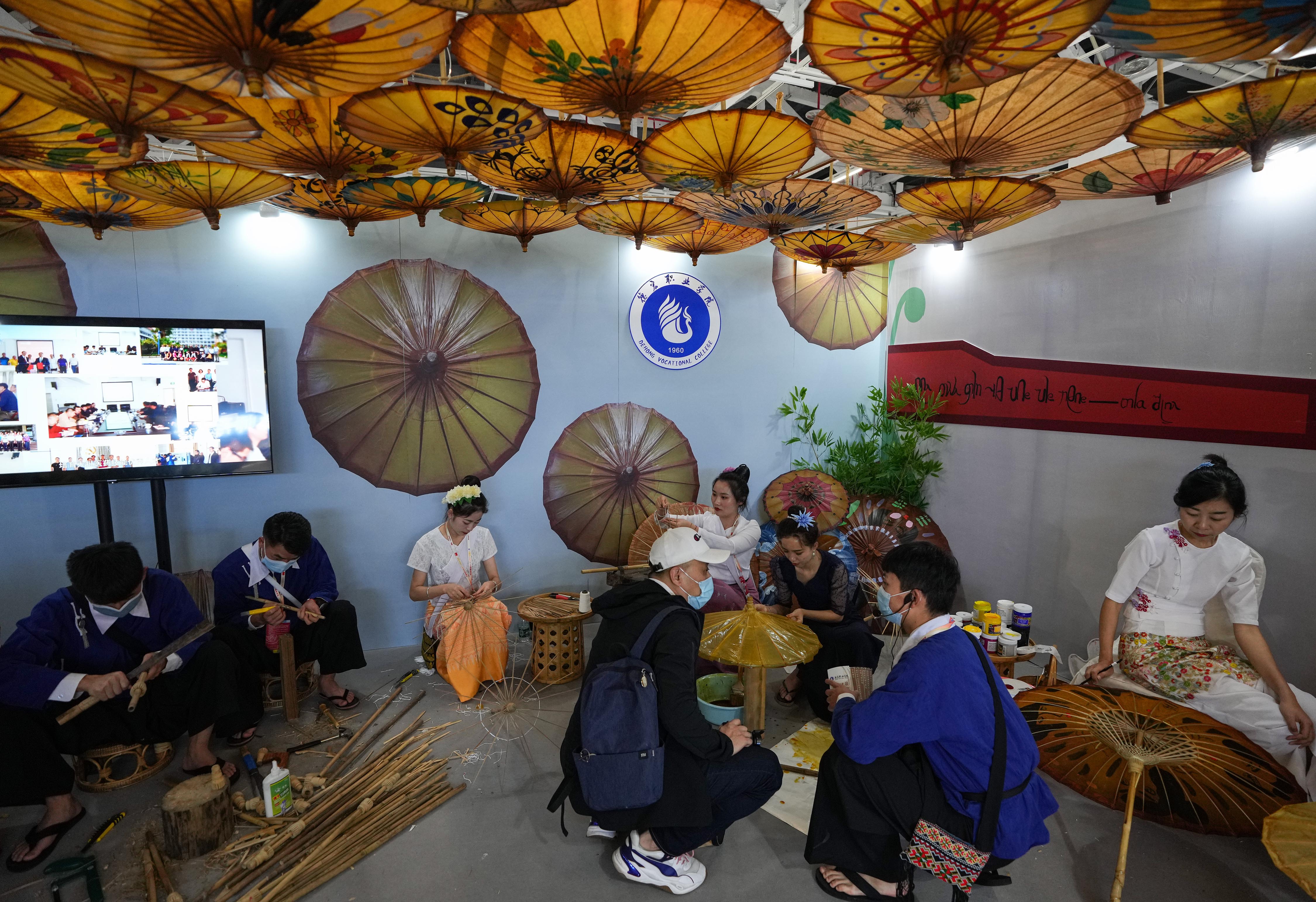(5月6日,在成都市东郊记忆国际艺术展览中心,德宏职业学院大学生艺术实践工作坊展台里,师生们正在展演傣族油纸伞的制作工艺。新华社记者江宏景摄)