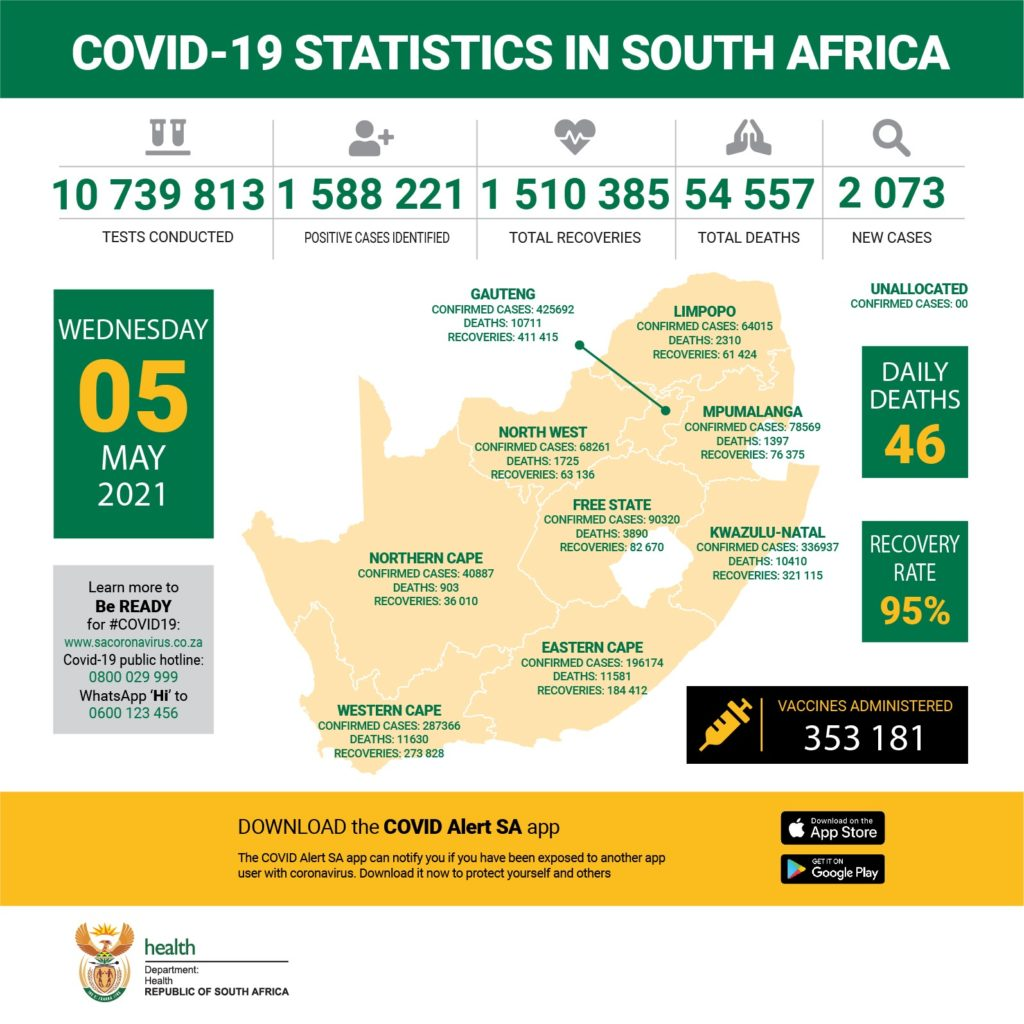 5月5日南非卫生部确认南非当天新增新冠肺炎确诊病例2073例,累计确诊达1588221例。南非全国已检测106739813人,当日检测33414人。