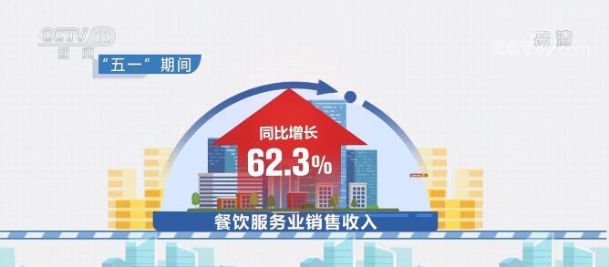说完了住,再来看看吃。今年“五一”期间,家人团圆、朋友聚会、出行就餐等需求带动餐饮服务业发展加快,继春节首次超过2019年同期水平后,增幅进一步扩大。餐饮服务业销售收入同比增长62.3%,两年平均增长17%,两年平均增幅分别比春节、清明期间提高14.3和5.9个百分点。