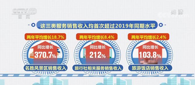 国家税务总局增值税发票数据显示,“五一”期间旅游相关行业销售收入同比增长153.4%,两年平均增长5.3%。其中,名胜风景区销售收入同比增长了370.7%,两年平均增长18.7%;旅行社相关服务受到国内跨省游热度上升带动,销售收入同比增长212%,两年平均增长8.4%;受旅游相关服务全面恢复带动,旅游饭店同比增长103.8%,两年平均增长2.4%。这三类服务销售收入均首次超过2019年同期水平。