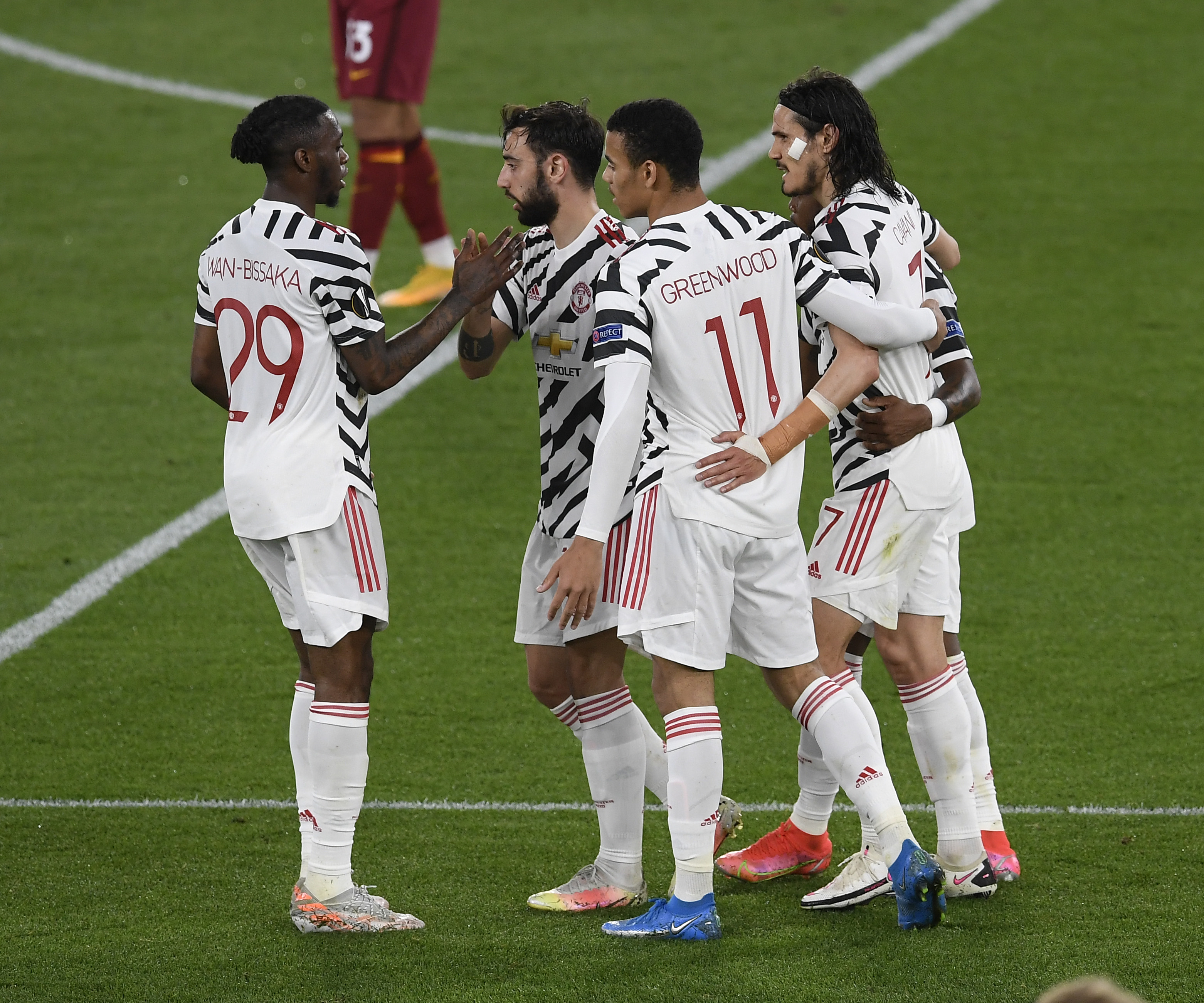 5月6日,曼联队球员卡瓦尼(右一)进球后与队友格林伍德(右二)、比萨卡(左一)等庆祝。新华社发(奥古斯托·卡萨索利摄)