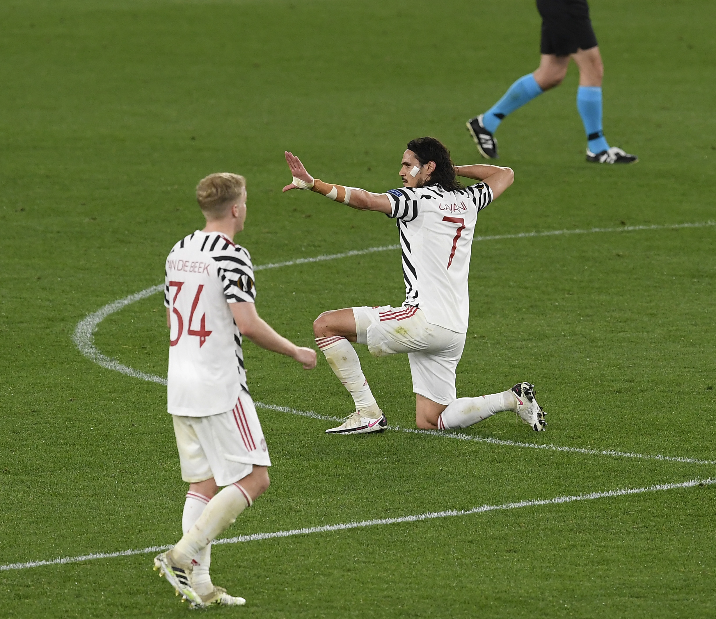 5月6日,曼联队球员卡瓦尼(右)在比赛中庆祝进球。新华社发(奥古斯托·卡萨索利摄)