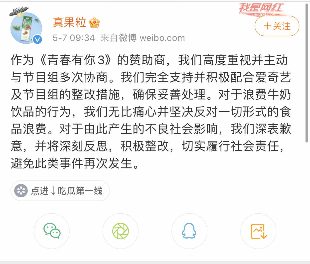 蒙牛“真果粒”7日发布的致歉声明表示:作为《青春有你3》的赞助商,我们高度重视并主动与节目组多次协商。我们完全支持并积极配合爱奇艺及节目组的整改措施,确保妥善处理。对于浪费牛奶饮品的行为,我们无比痛心并坚决反对一切形式的食品浪费。对于由此产生的不良社会影响,我们深表歉意,并将深刻反思,积极整改,切实履行社会责任,避免此类事件再次发生。