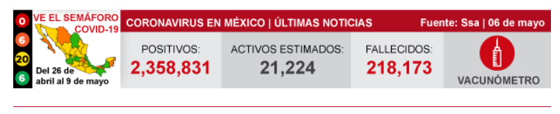 当地时间5月6日,墨西哥卫生部宣布,截至当天19时,墨西哥全国累计确诊新冠肺炎病例2358831例,较前一天新增2846例。墨西哥新冠肺炎死亡病例累计218173例,较前一天新增166例。(总台记者 盛嘉迪 吕兴林)