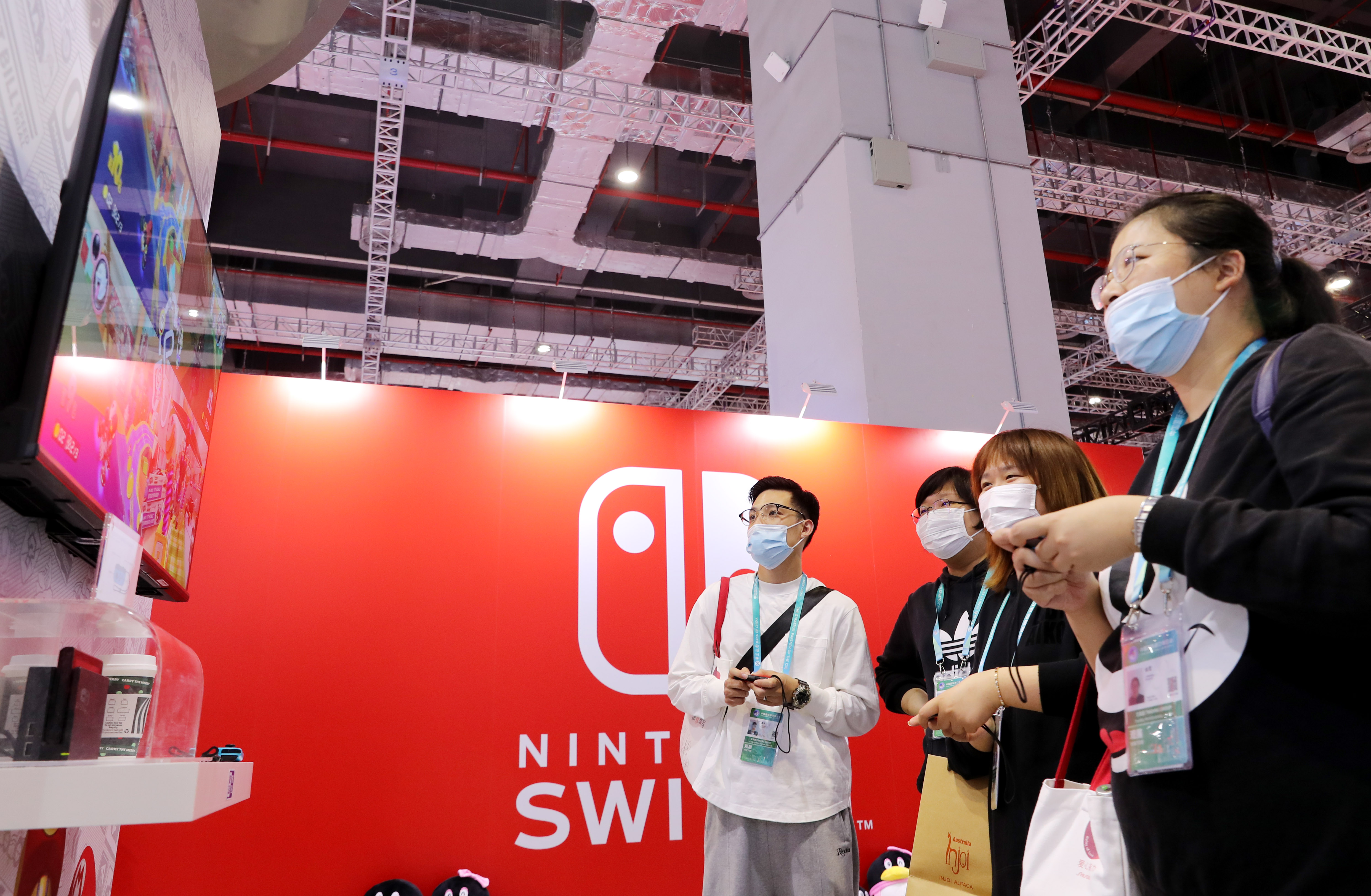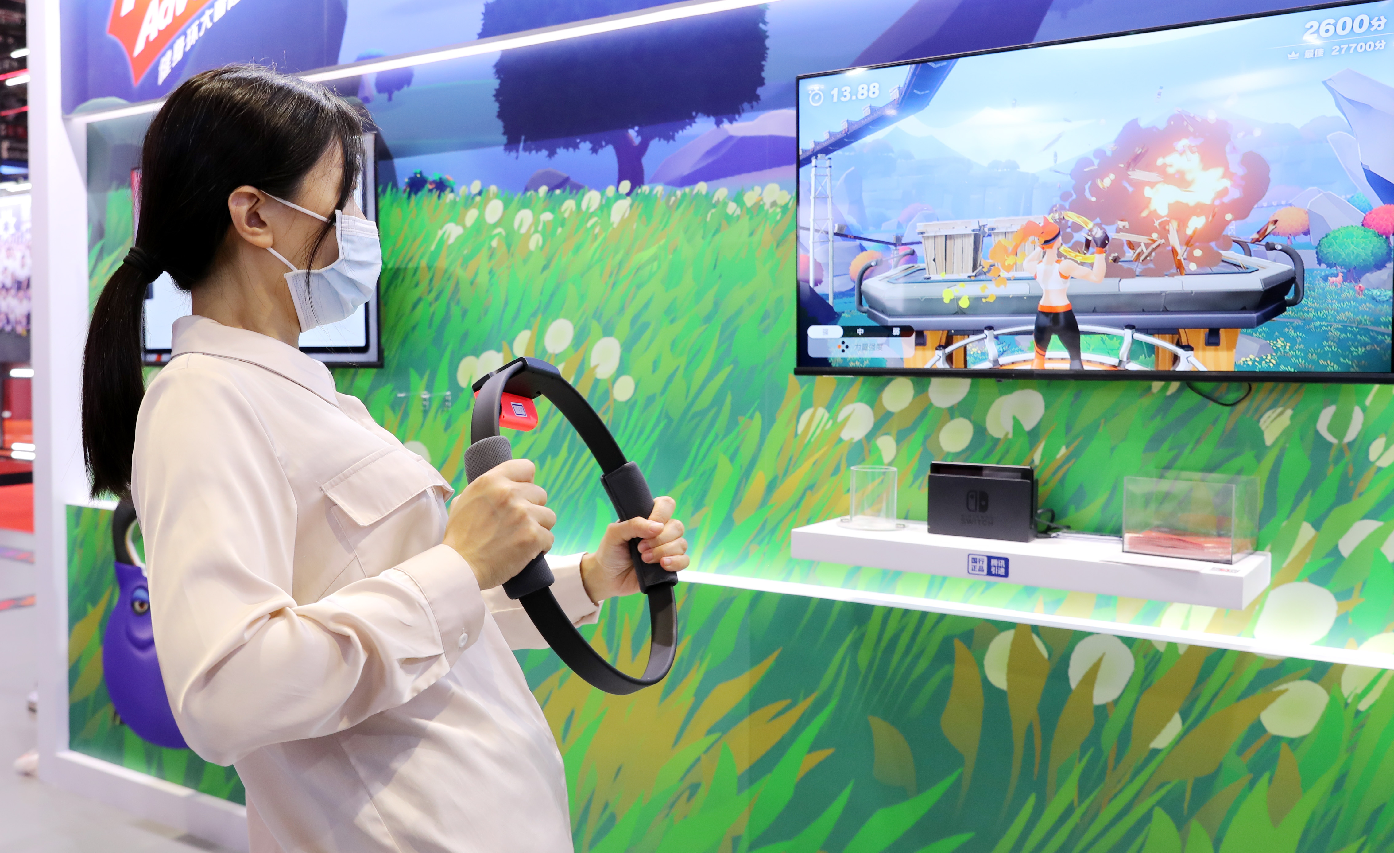 2020年11月6日,观众在上海进博会消费品展区的任天堂公司展台体验健身环游戏。(新华社记者方喆摄)
