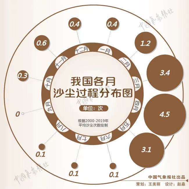 我国沙尘天气主要出现在春季和冬季,其次为秋季,夏季最少。春季(3-5月)发生的沙尘天气次数,占到全年的77.5%。其中,沙尘天气最频繁发生的月份是4月,其次为3月和5月。