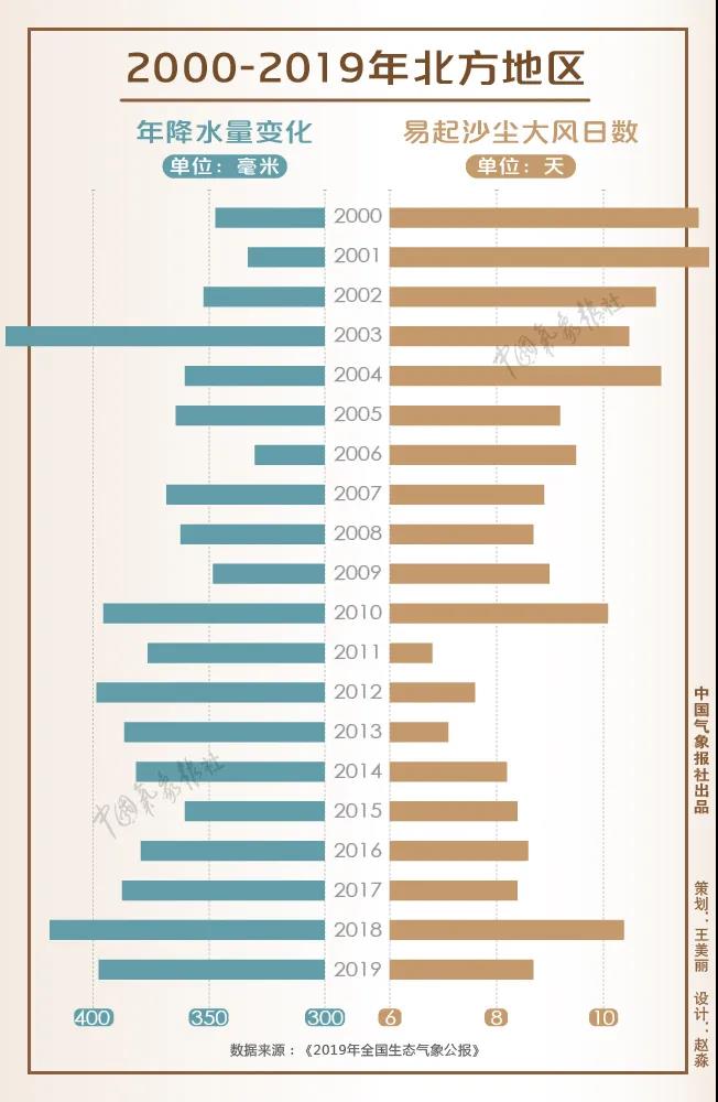 2000-2019年北方地区年降水量变化及易起沙尘大风日数。来源:中国气象报社
