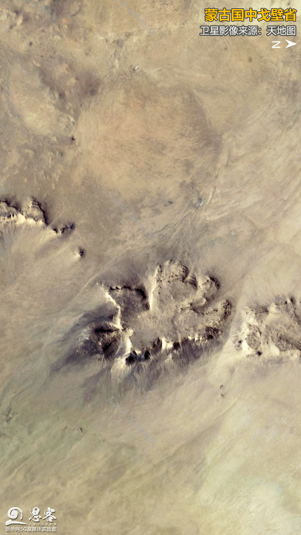 卫星拍到的蒙古国中戈壁省的部分区域,土地荒漠化程度肉眼可见。卫星影像来源:天地图