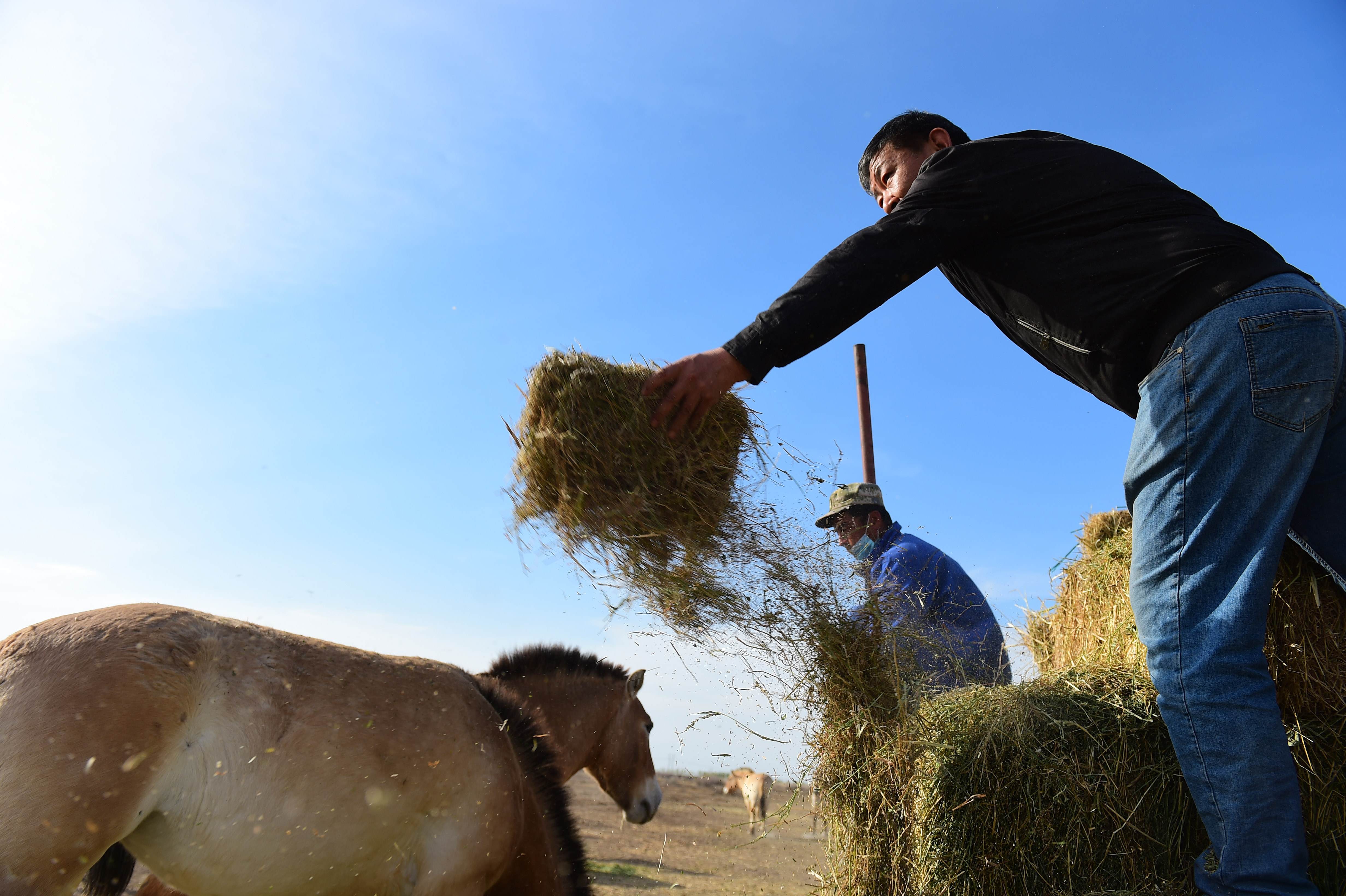 新疆野马繁殖研究中心工程师张彦豹(右)饲喂普氏野马(新华社记者侯昭康 摄)