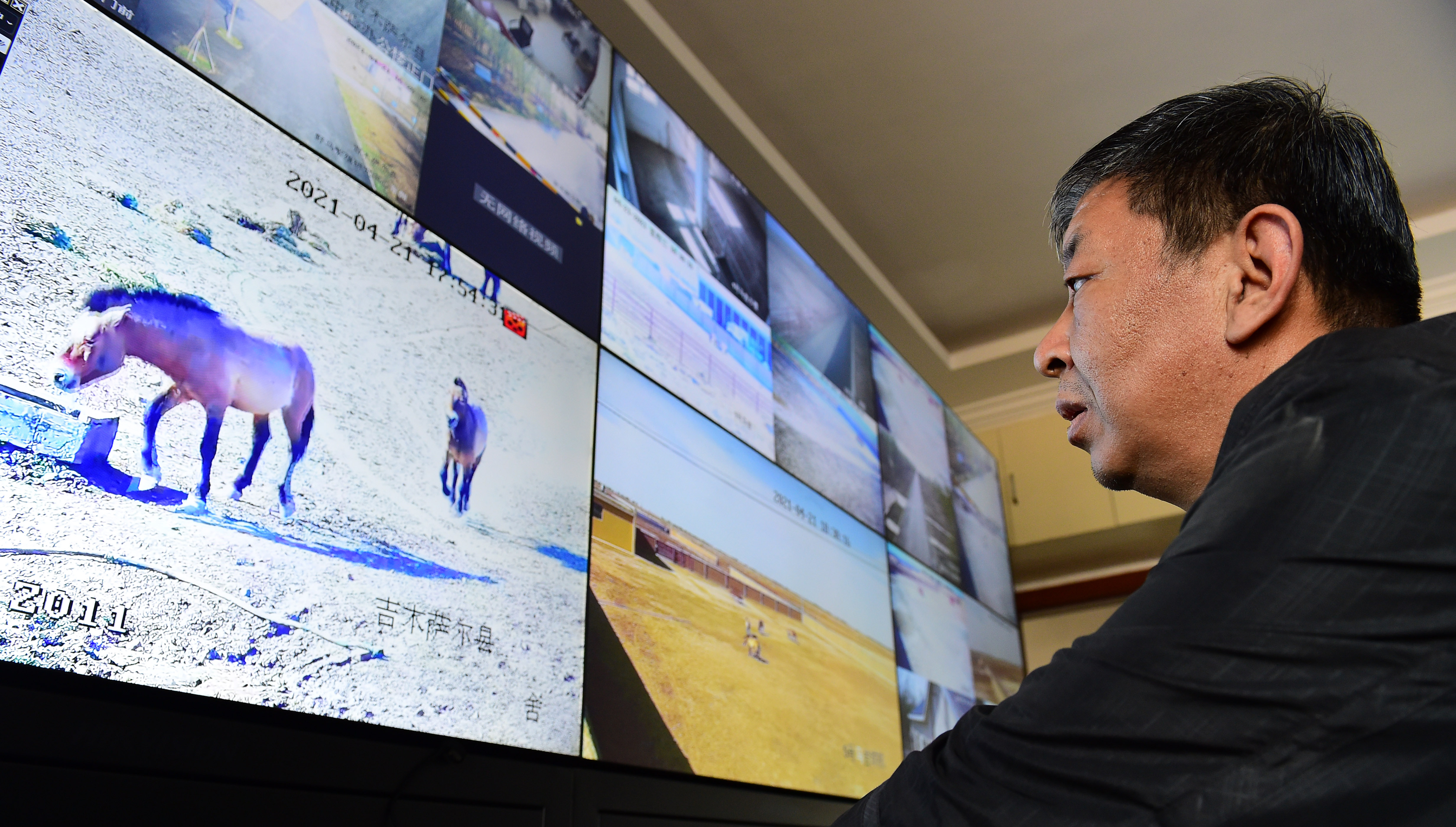 新疆野马繁殖研究中心工程师张彦豹观看视频监控(新华社记者侯昭康 摄)