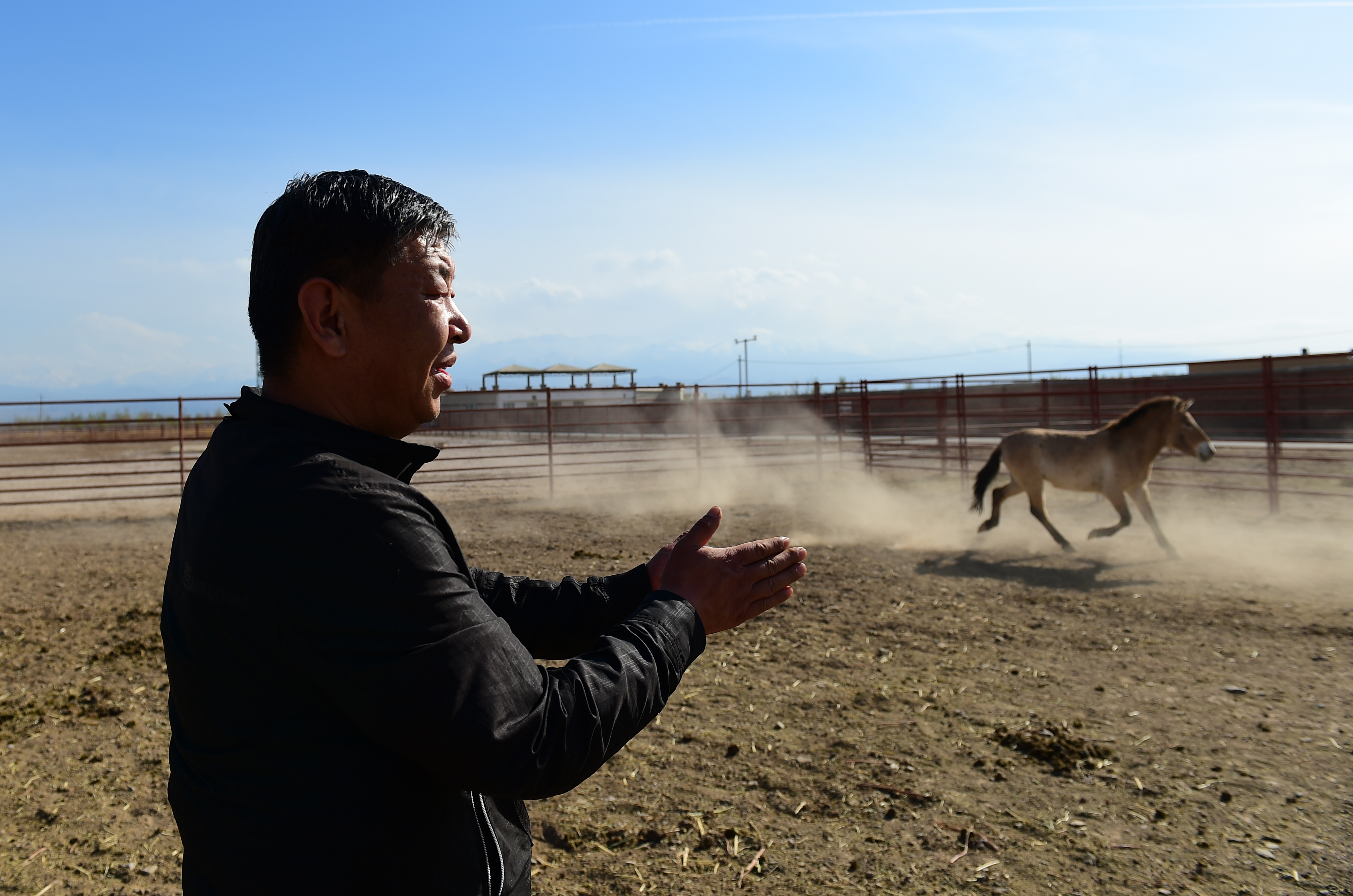 新疆野马繁殖研究中心工程师张彦豹对普氏野马进行野化训练(新华社记者侯昭康 摄)