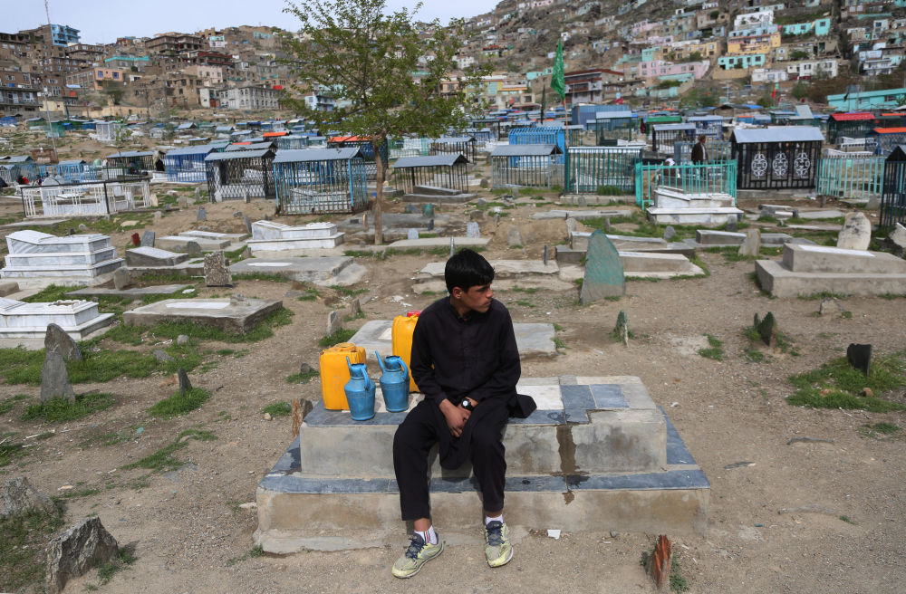 4月16日,一名男孩在阿富汗喀布尔一处墓地卖水。新华社发