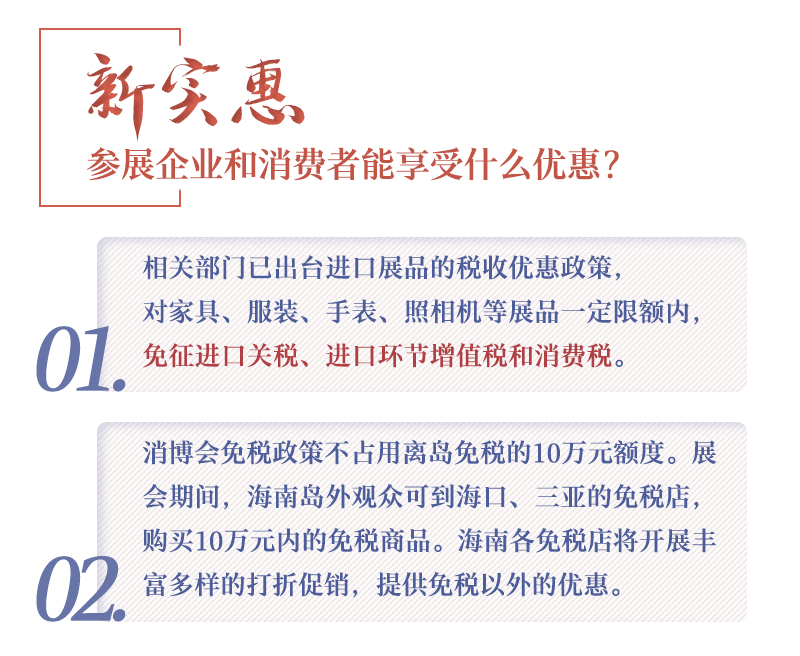 除了空前的展览规模,本届消博会还为参展企业和消费者提供税收优惠政策:家具、服装、手表、照相机等展品一定限额内,免征进口关税、进口环节增值税和消费税,并且消博会提供的免税政策不占用离岛免税的10万元额度。