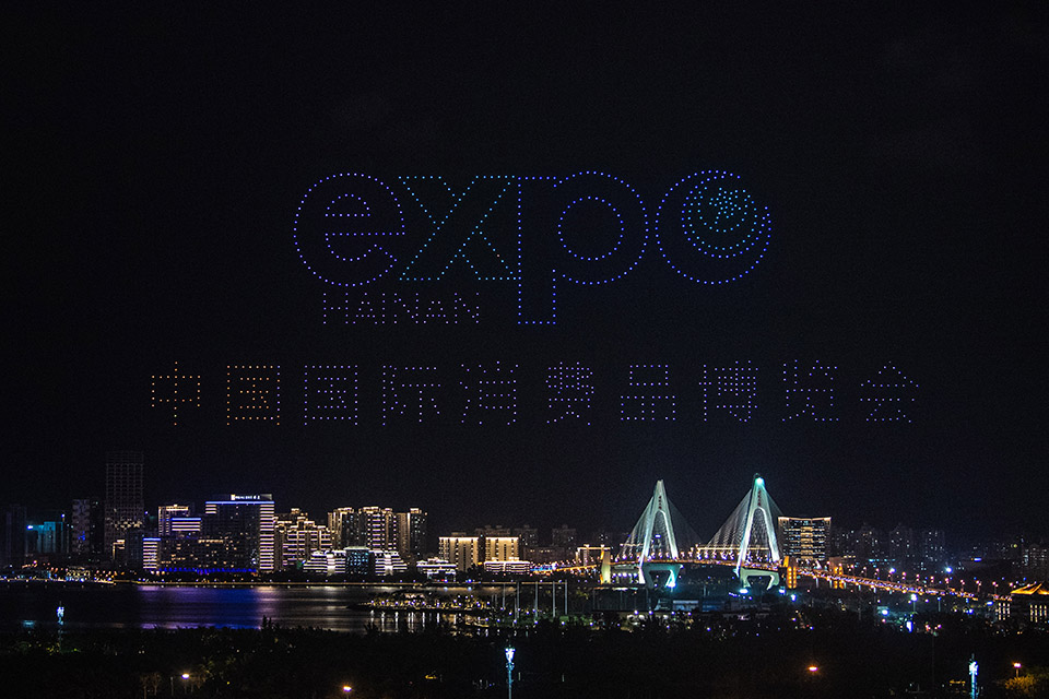 首届中国国际消费品博览会于5月7日至10日在位于海口的海南国际会展中心举办。5月6日晚,海口市上演无人机表演秀,迎接首届消博会的举办。新华社记者 蒲晓旭 摄