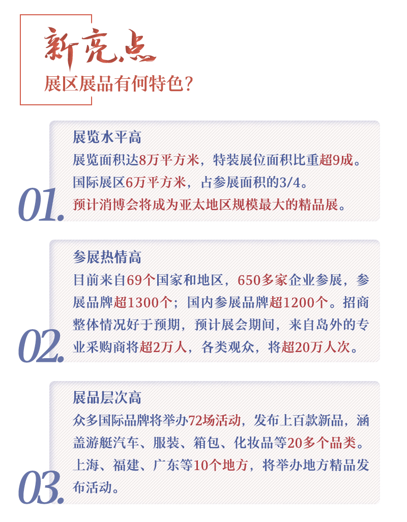 本届中国国际消费品博览会规模盛大,立志于打造亚太地区规模最大的精品展。空前的规模吸引了来自69个国家和地区的650多家企业参展,参展品牌超1300个,其中国内参展品牌超1200个。从服饰箱包到美妆精品,从珠宝钻石到游艇汽车,将有上百款消费精品首发首秀。