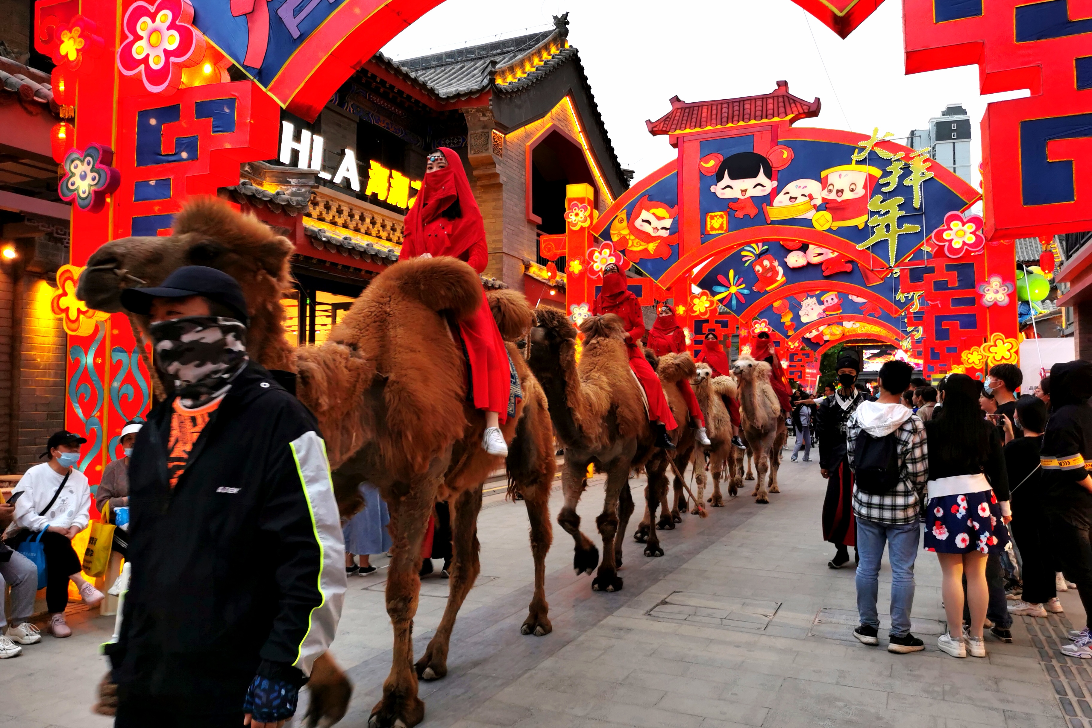 5月4日,一袭红裙的“楼兰少女”在驼队护送下穿越“兰州老街”景区。新华社记者 郎兵兵 摄