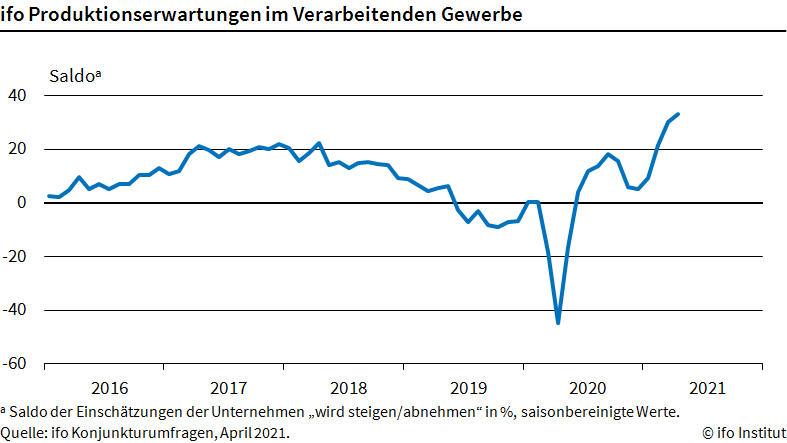 另外,德国知名智库伊弗经济研究所同一天发布报告称,2021年4月德国制造业前景继续呈现出向好趋势,反映业界对未来数月发展预期的指数连续第五个月得到改善,从3月的30.2点上升至33.1点,继续刷新1991年以来的最高数值。对此,该研究所专家指出,继2020年的疫情危机年之后,工业需求持续复苏、订单增多,几乎所有行业都计划增产——尤其在汽车和电气领域,乐观情绪最为明显。