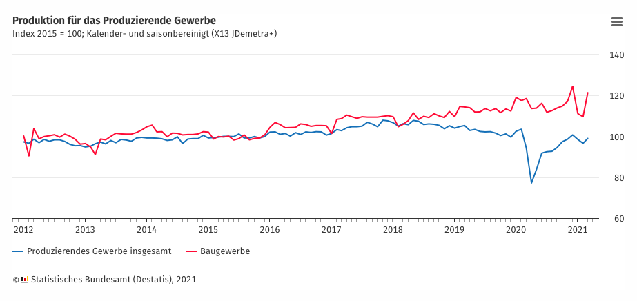 △德国联邦统计局发布的工业生产指数走势图(红线为制造业整体;蓝线为建筑业 图片来源:德国联邦统计局)