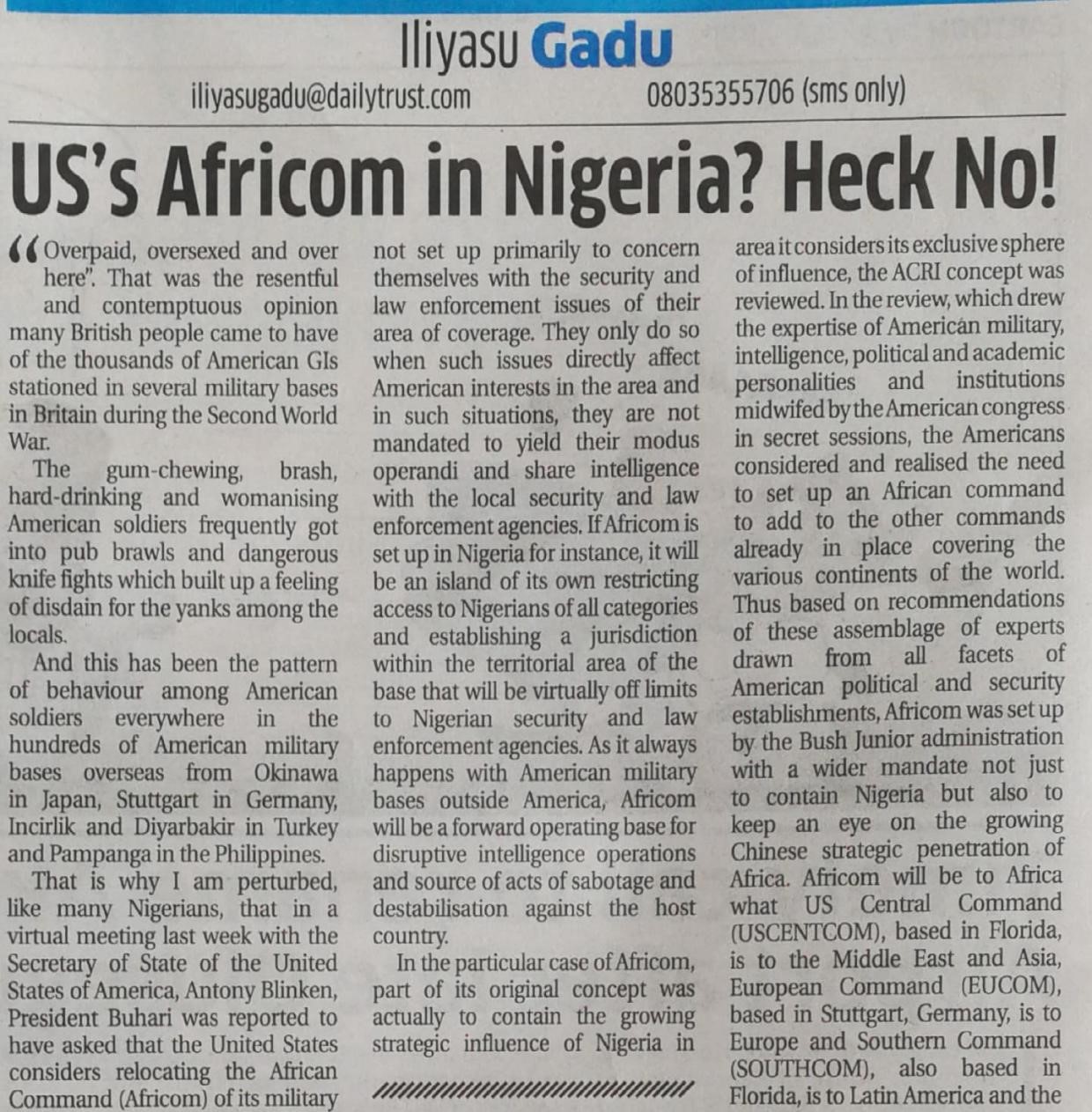 布哈里向布林肯提出美军非洲司令部从德国迁往非洲后,在尼日利亚舆论场引发广泛批评。《每日信报》(Daily Trust)5月6日刊登的一篇题为《美国的非洲司令部进驻尼日利亚?不!》的评论,作者里亚苏·噶杜(Iliyasu Gadu)在文章中指出,布哈里的态度令人感觉是有意邀请其驻扎在尼日利亚。如果非洲司令部在尼日利亚设立,它将成为一个岛屿,限制各类尼日利亚人进入,并在基地范围内建立管辖权,尼日利亚安全和执法机构实际上将禁止进入。正如在美国以外的美国军事基地经常发生的那样,非洲司令部将成为破坏性情报行动的前沿基地,也是针对东道国的破坏稳定行动的来源。尼日利亚已经被尼日尔、喀麦隆、乍得和贝宁的法国军队包围,美国在尼日尔也有一个无人机基地。在尼日利亚建立美军非洲司令部将意味着尼日利亚对法国和美国战略利益的完全投降,就等于让狼进了鸡笼。