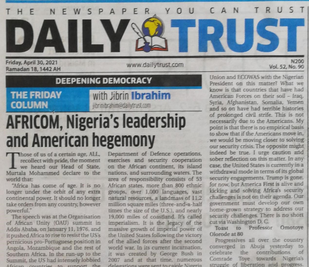 △尼日利亚网络媒体《优质时报》(Premium Times)和纸质版《每日信报》(Daily Trust)5月4日发表《美军非洲司令部:尼日利亚的领导地位和美国的霸权》的评论。
