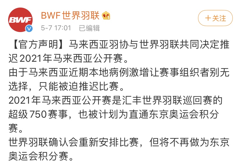世界羽联在一份声明中表示,赛事主办方以及世界羽联已经做了尝试,试图向所有参加者提供一个安全的赛事环境,但最近的新增新冠肺炎病例大幅上升导致赛事被迫推迟。