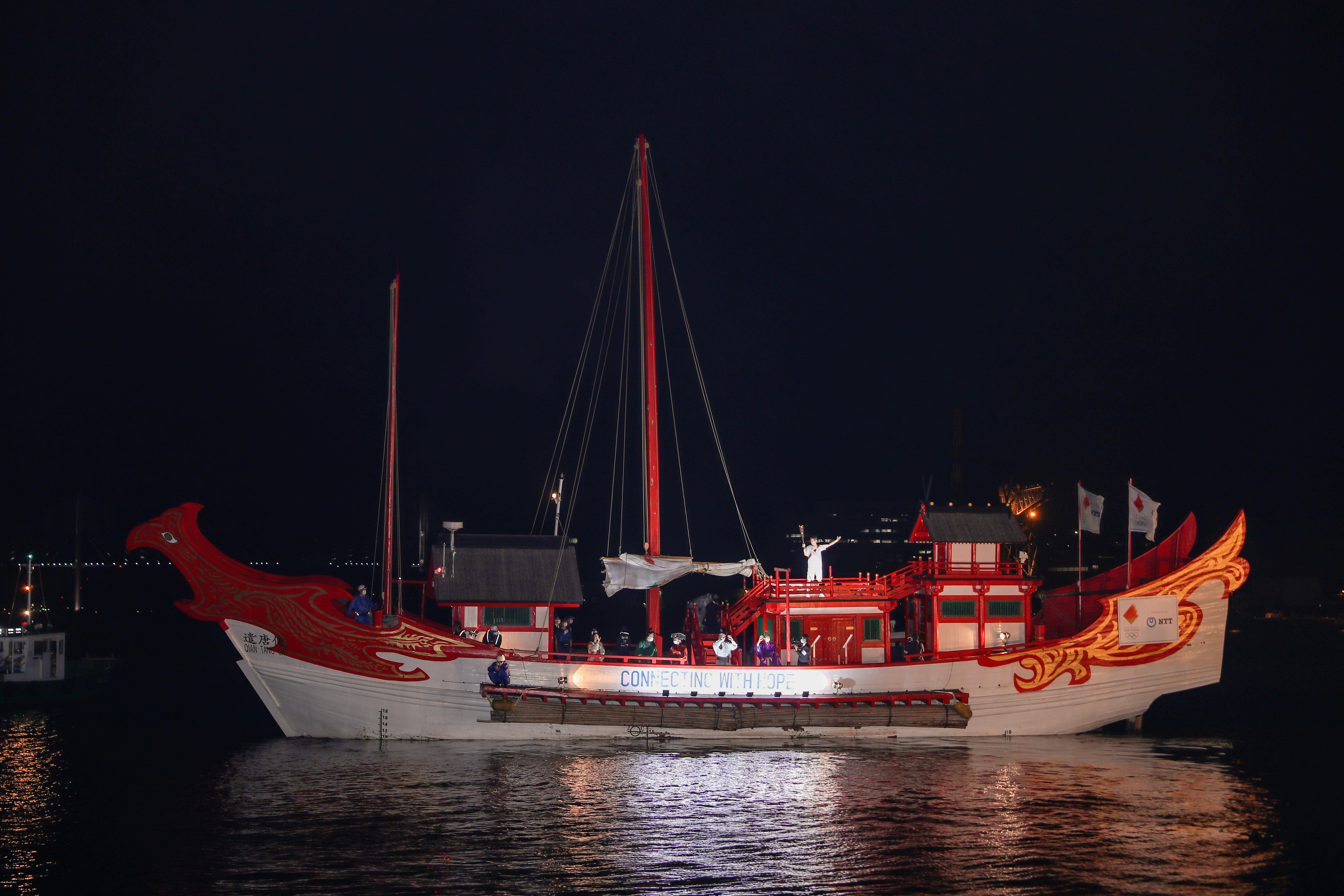 小林充佳是日本电信电话公司西日本公司的社长,他手举火炬,缓步登上色调鲜红的“遣唐使船”。该船从长崎县政府旁的岸边出发,行驶约一千米至对岸的水边森林公园,耗时约20分钟。