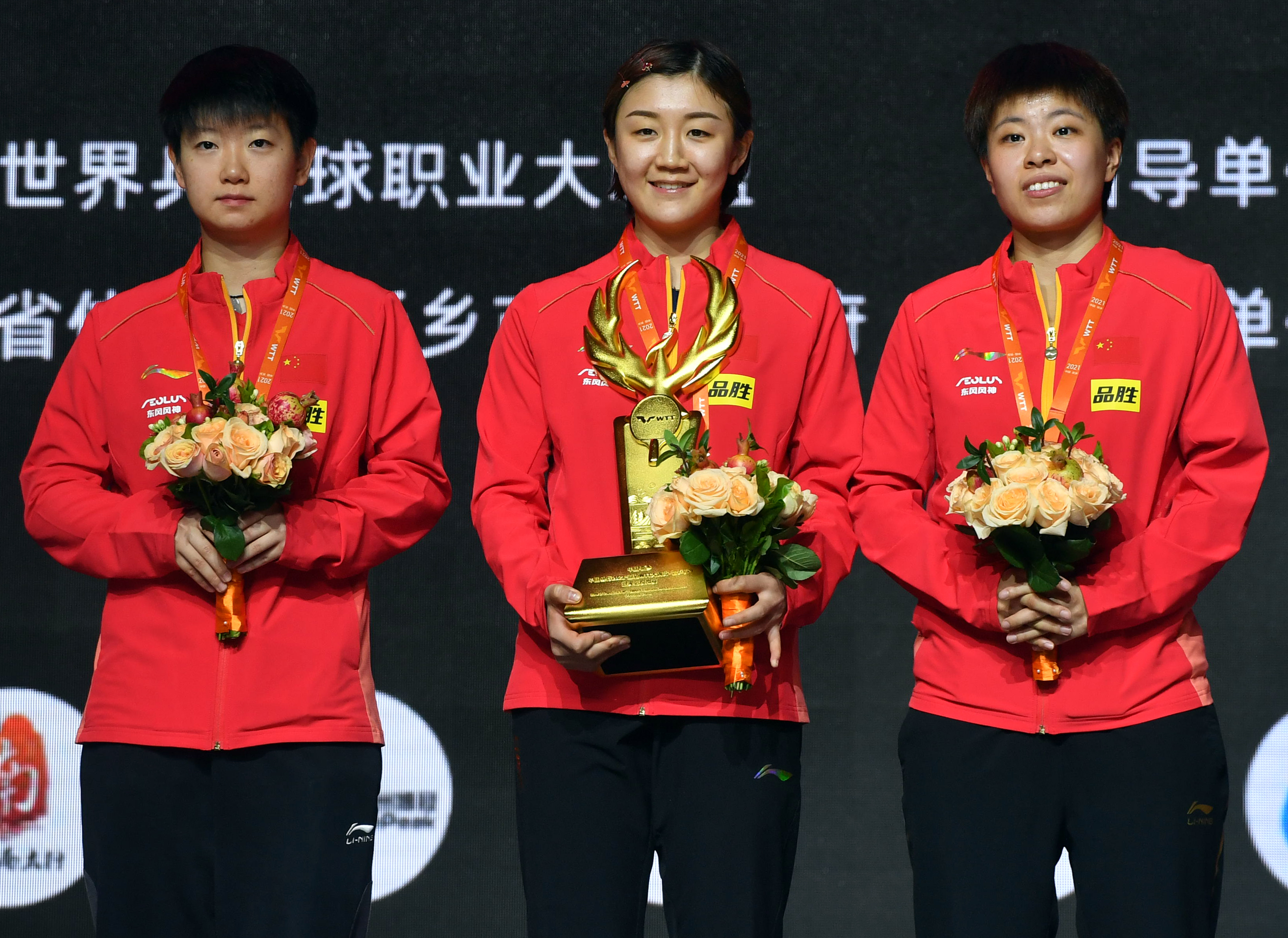 5月7日,女单冠军陈梦(中)、亚军孙颖莎(左)与季军王艺迪在颁奖仪式上。新华社记者 李嘉南 摄