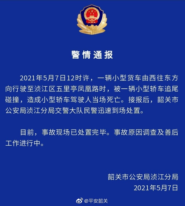 7日晚间,广东省韶关市公安局微博@平安韶关通报,5月7日12时许,一辆小型货车由西往东方向行驶至浈江区五里亭凤凰路时,被一辆小型轿车追尾碰撞,造成小型轿车驾驶人当场死亡。接报后,韶关市公安局浈江分局交警大队民警迅速到场处置。