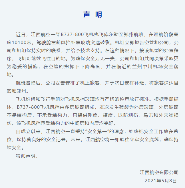 近日,江西航空一架B737-800飞机执飞库尔勒至郑州航班,在巡航阶段高度10100米,驾驶舱左前风挡外层玻璃突遇破裂。5月8日,江西航空发表声明,全文如下: