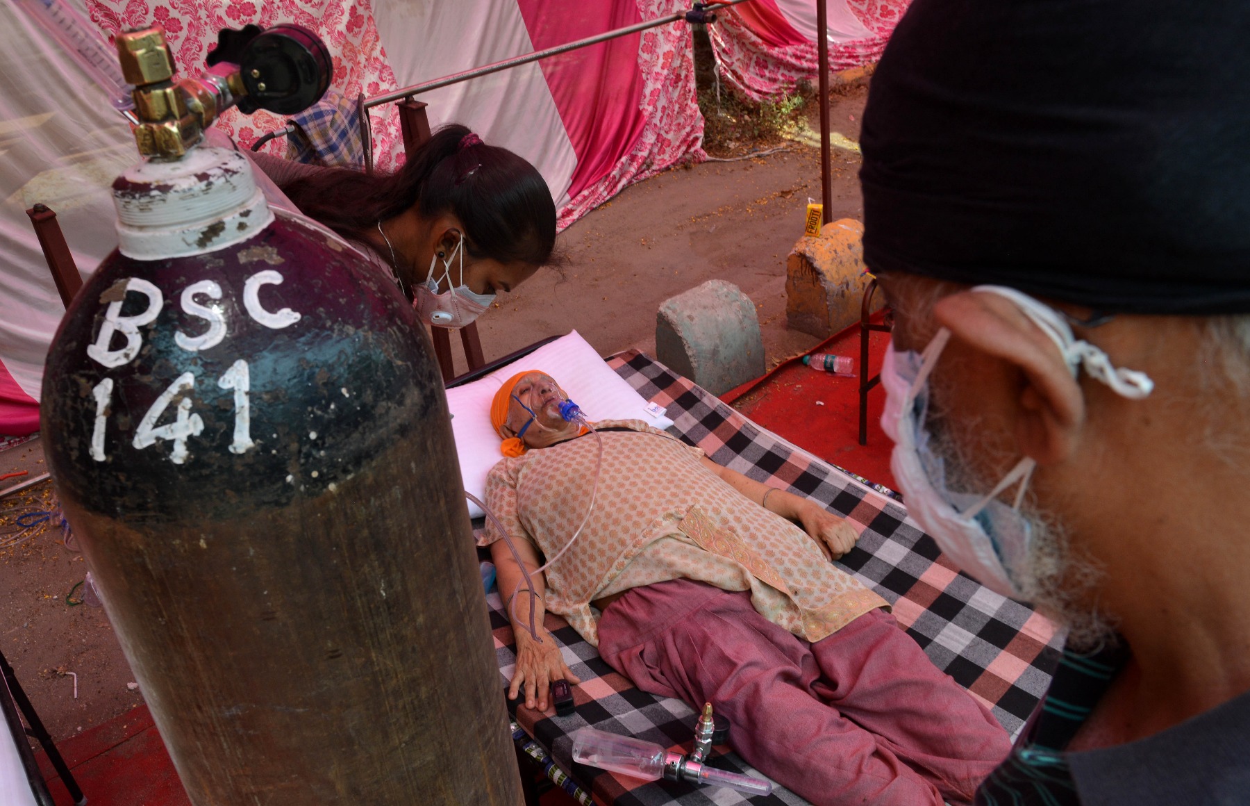 5月7日,一名新冠患者在印度北方邦的一处锡克教谒师所吸氧。(新华社发,帕塔·萨卡尔摄)