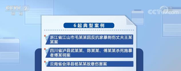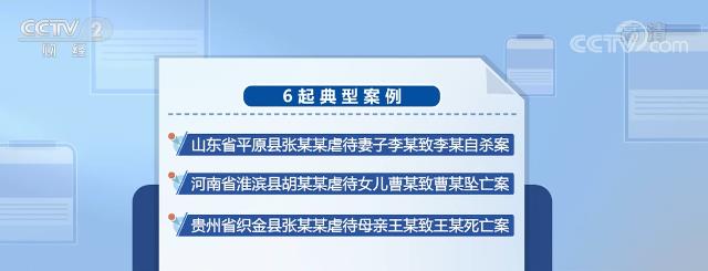 这6起典型案例分别为:山东省平原县张某某虐待妻子李某致李某自杀案;河南省淮滨县胡某某虐待女儿曹某致曹某坠亡案;贵州省织金县张某某虐待母亲王某致王某死亡案;浙江省江山市毛某某因反抗家暴刺伤丈夫王某某案;四川省泸县武某某、陈某某、傅某某杀死施暴者傅某明案;云南省会泽县杨某某故意伤害案。