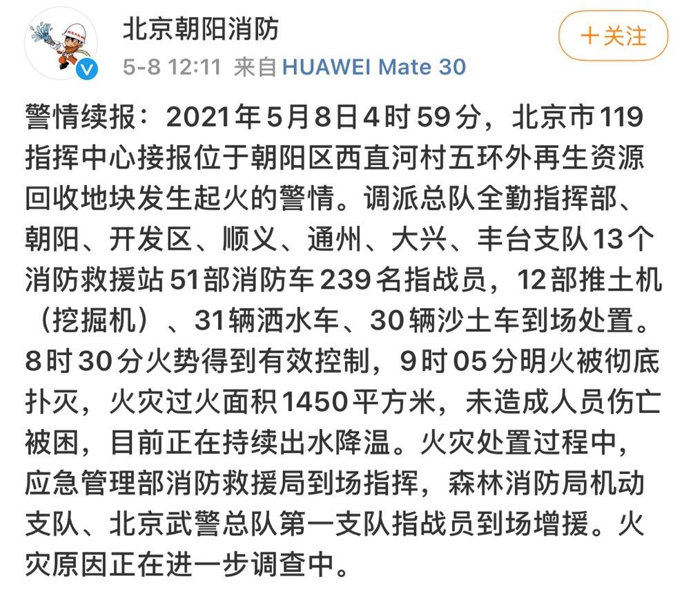 2021年5月8日4时59分,北京市119指挥中心接报位于朝阳区西直河村五环外再生资源回收地块发生起火的警情。调派总队全勤指挥部、朝阳、开发区、顺义、通州、大兴、丰台支队13个消防救援站51部消防车239名指战员,12部推土机(挖掘机)、31辆洒水车、30辆沙土车到场处置。