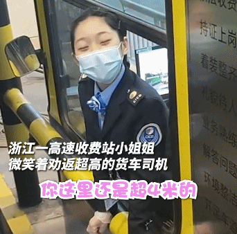 4月18日,浙江金华一大货车因超高在收费站入口被拦下,工作人员小姐姐把头探出窗口,微笑着和司机耐心解释货车超高上高速太危险,需要掉头。