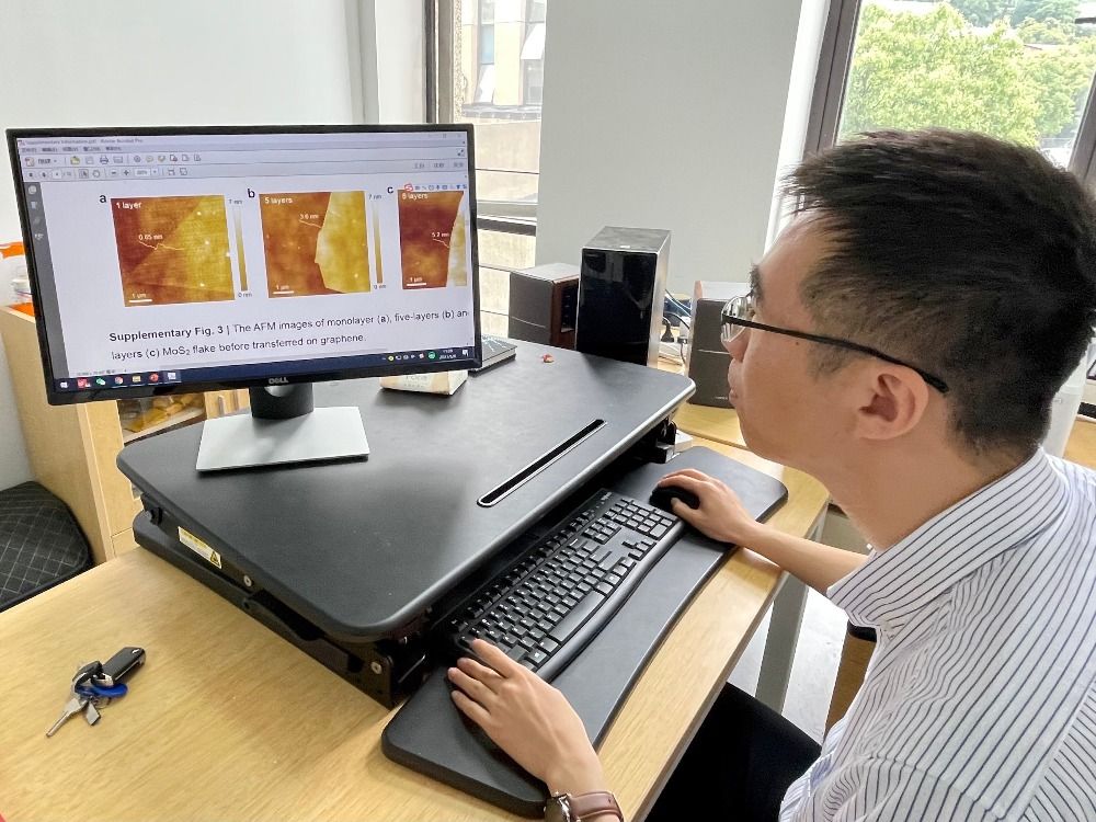 刘渊教授在电脑屏幕上展示超短沟道垂直场效应晶体管照片,其有效沟道长度最短可小于1纳米(5月6日摄)。 新华社记者 苏晓洲 摄